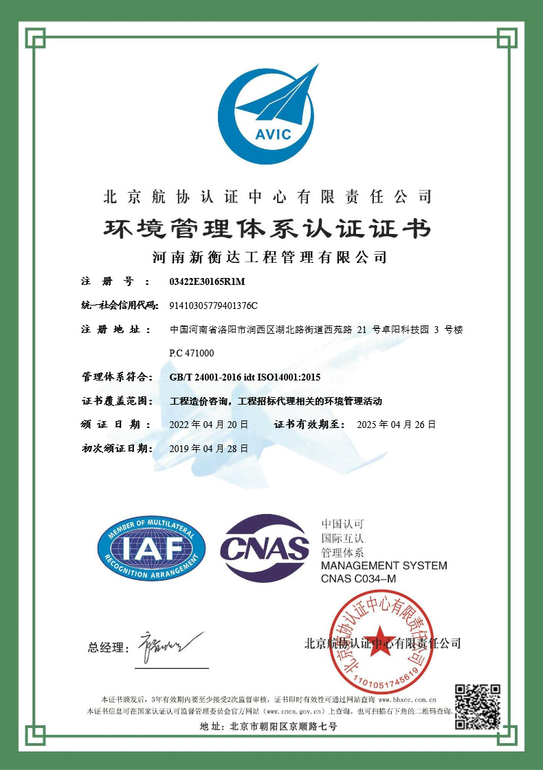 環(huán)境管理體系認(rèn)證證書