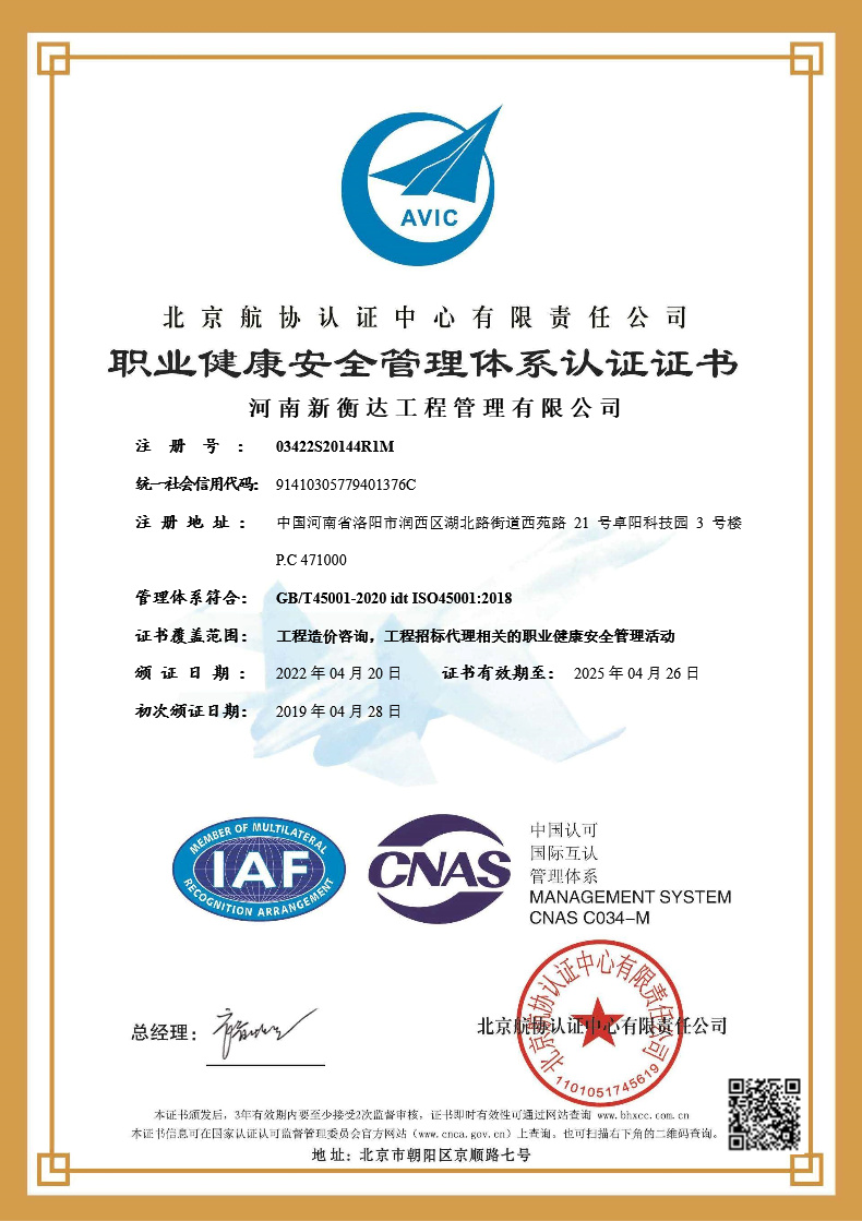 職業(yè)健康安全管理體系認(rèn)證證書