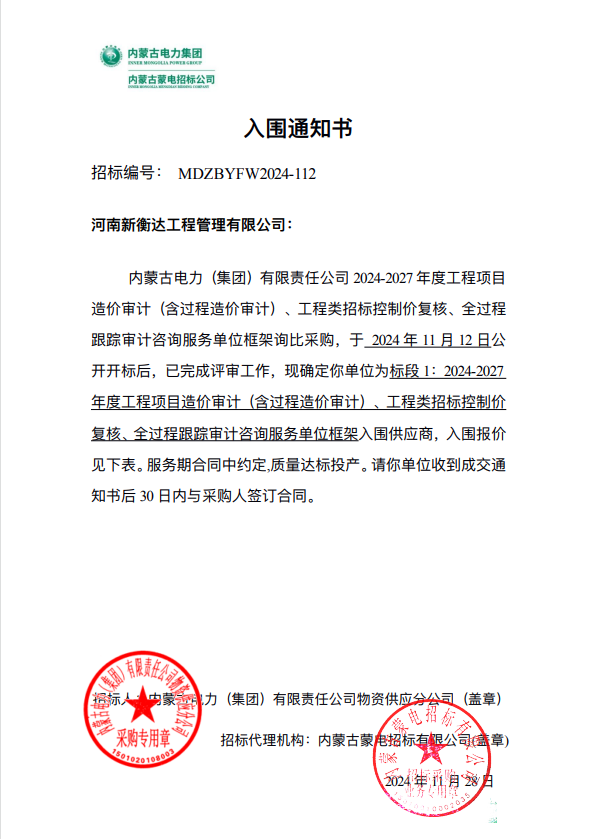 近日,我公司收到內(nèi)蒙古電力集團(tuán)的入圍通知書,被確定為內(nèi)蒙古電力(集團(tuán))有限責(zé)任公司2024-2027年度工程項目造價審計(含過程造價審計)、工程類招標(biāo)控制價復(fù)核、全過程跟蹤審計咨詢服務(wù)單位框架入圍供應(yīng)商。